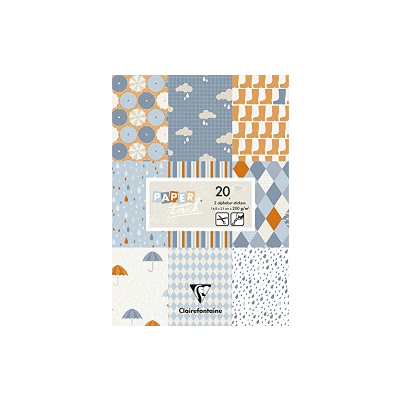 Clairefontaine 95241C Paper Touch Block with 20 Sheets Printed Craft Card 200 g DIN A5 14.8 x 21 cm + Stickers Alphabet + Labels, for Scrapbooking and Craft Activities, Rain, Pack of 1