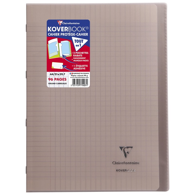 Clairefontaine 971407C Exercise Book / Exercise Book DIN A4 21 x 29.7 cm, 48 Sheets 90 g, French Ruling, Transparent Polypropylene Cover, 2 Transparent Pockets + 1 Label, Stapled, Grey, Pack of 1
