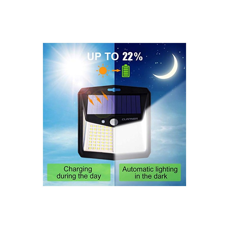 - ☀【Upgraded Solar Outdoor Lights】Upgraded solar motion lights for outside are here for you. Claoner solar powered motion lights have a 270°illumination angle, which is 200% broader than other solar lights on the market and provides larger illumination coverage. The rechargeable battery can provide a longer lighting time than other similar products. Three kinds of lighting modes for your choice to meet your different needs.