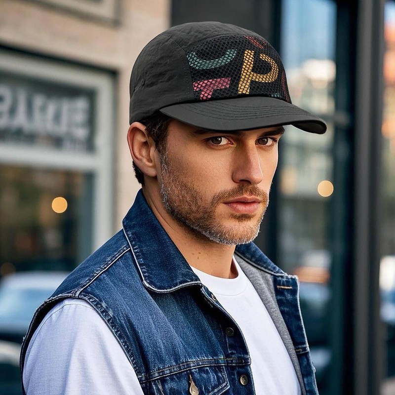 - ADJUSTABLE 5 PANEL RUNNING HAT The 5-panel design ensures optimal fit to the head shape. This trucker hat has an adjustable buckle on the back of the hat, the head circumference can be freely adjusted between 56-61 cm, perfect fit for different head shapes