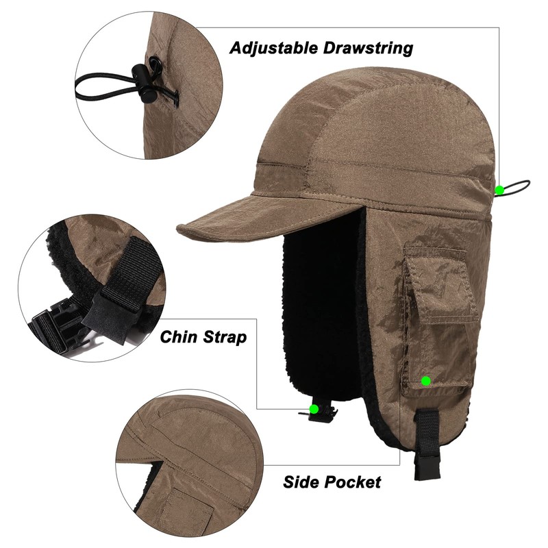 - Unisex Russian Ushanka Hat: Classic Russian-Ushanka Hat style, novel brim of the hat can be freely changed whether flipped up or down, and if you're creative enough, you can pull it down to block light when you're napping, like an eye mask; A chic pocket on the side of the ear flap, which can also be used to hold small items such as cards.