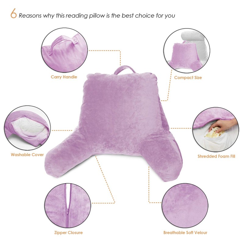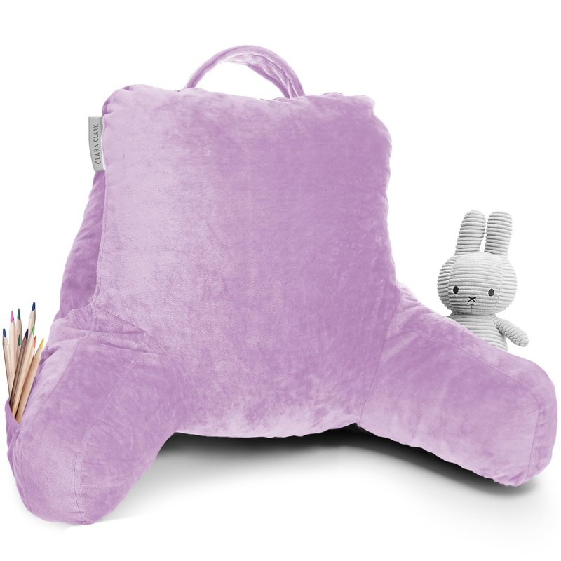 Clara Clark Reading Pillow for Kids, Small Back Pillow for Sitting Up in Bed, Memory Foam Back Support Pillow, Reading Pillows for Sitting in Bed, Lavender Gaming Pillow for Bed with Arms and Pockets