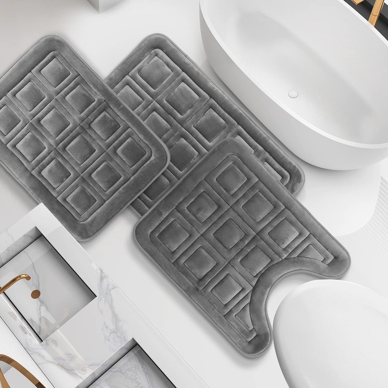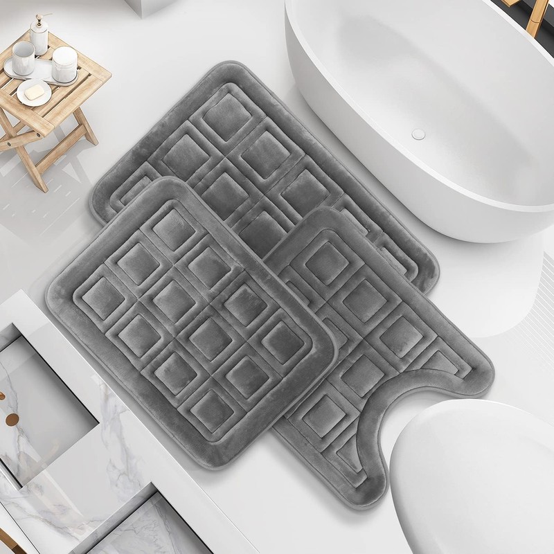 Clara Clark Set of 3 Bath Mats, Non-Slip Velvet Memory Foam Bathroom Rugs, Machine Wash, Soft and Plush Bath Rugs, 17 x 24 Inch, 20 x 32 Inch & U-Shaped 20 x 24 Inch, Waffle Design - Gray