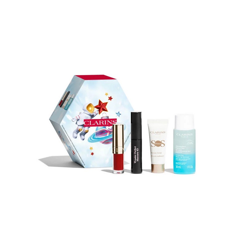 This set contains all the essentials to enhance skin natural complexion. SOS Primer to even out skin tone and boost radiance, and a subtly tinted glossy and nourishing lip oil. And for the eyes, an instant eye make-up remover that gently removes make-up (suitable for sensitive eyes) and Wonder Perfect 4D Mascara that gives lashes volume, length and curl.