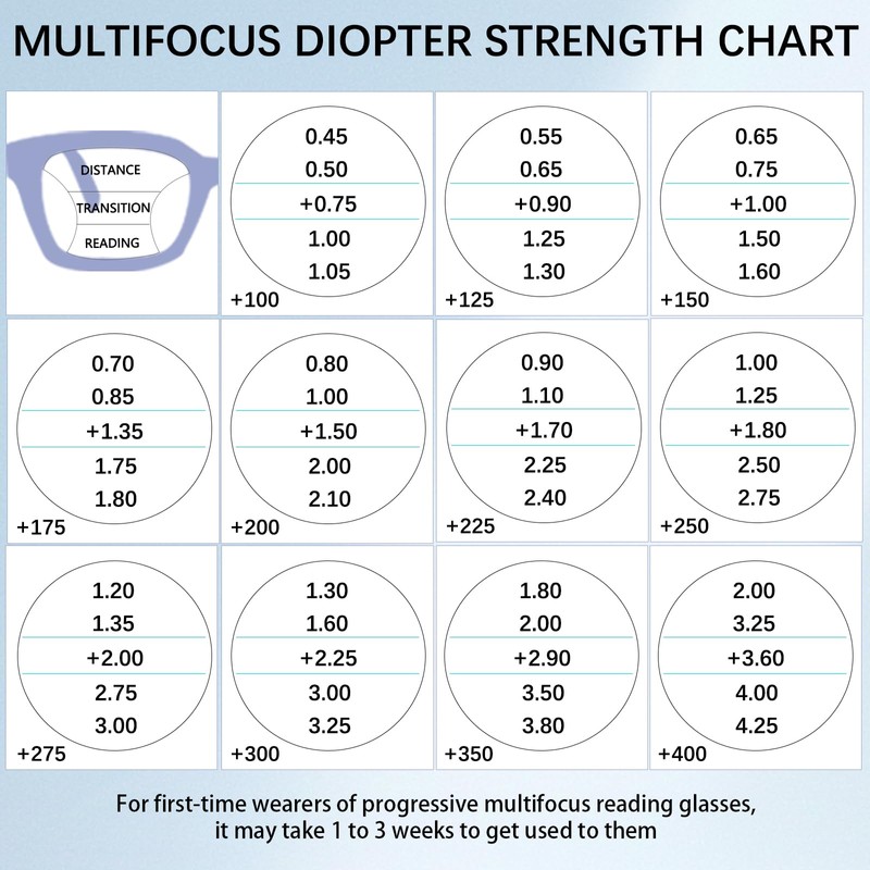 - 【Warm Tips】It may take you a little time to get used to wearing these multifocal reading glasses. When you first put on it, you may feel a little discomfortable. But there is no need to worry about it because you will focus better and enjoy wearing these progressive blue light readers a few days later