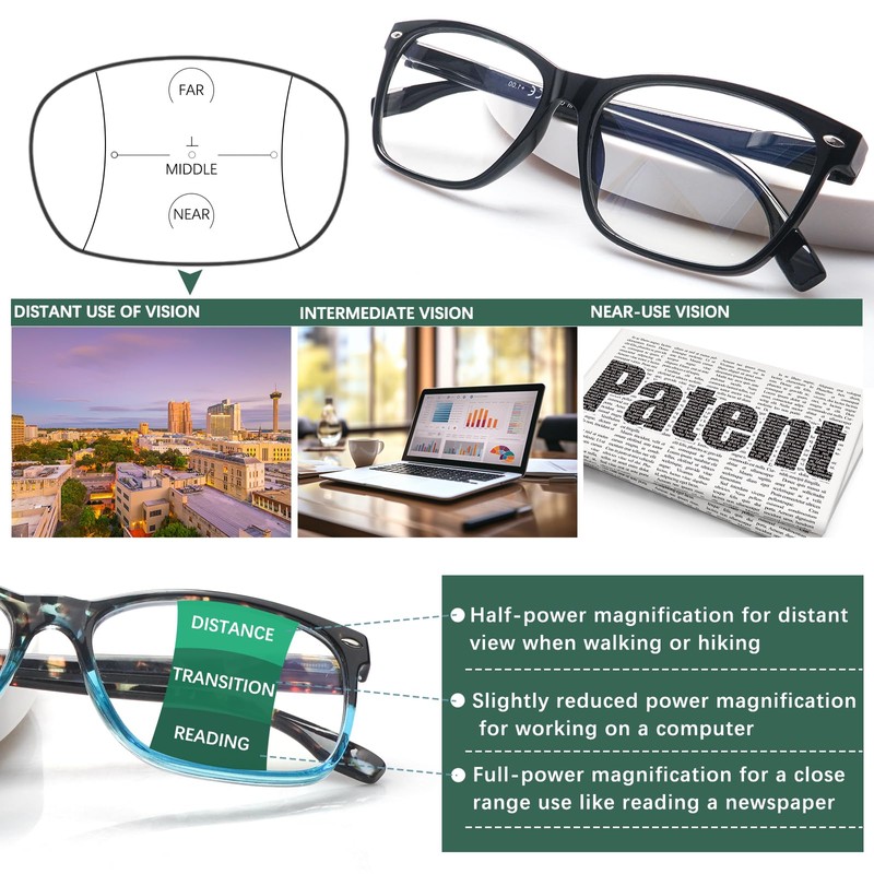 - 【Multifocus Lenses】Progressive reading glasses features multifocus lenses with 3 different visions. The bottom part is full-power magnification for reading. The middle part is slightly reduced power magnification for working on a computer and the top part is half-power magnification for walking, shopping and so on