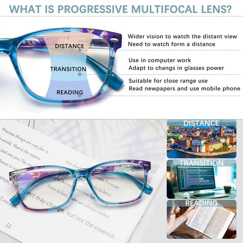 • 【Quality Material】Multifocus reading glasses for women are made from superior plastic lenses and frames with spring hinges. The plastic frame is lighter than metal ones that provide you a more comfortable wearing experience. What's more, spring hinges make these progressive readers adjustable to fit your face and thanks to the built-in nose pads, there is no impression on your nose bridge any more