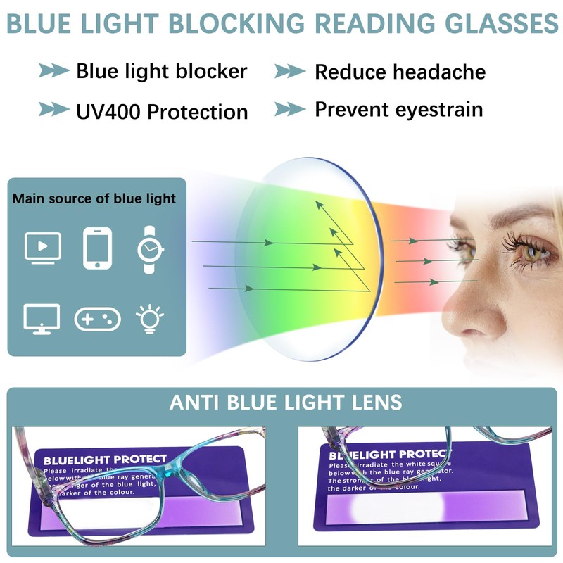 • 【Blue Light Glasses】Our blue light blocking reading glasses can effectively filter harmful blue light from computer or phone screens to protect your eyes, help to relieve your eye tiredness and prevent asthenopia. You sleep better after wearing these transition reading glasses