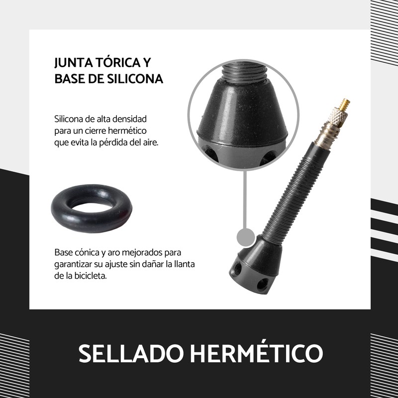- Hermetic seal: the O-ring and base are made of high-density silicone to make the closure airtight and avoid damage to the bicycle tyre.