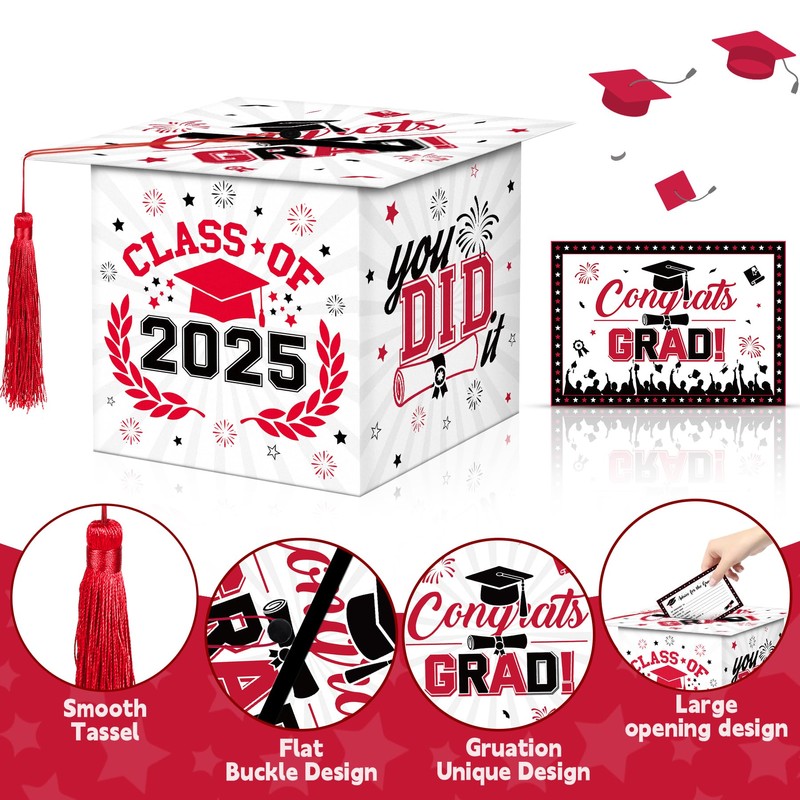 - UNIQUE DESIGN - Graduation Card boxes are designed with classic graduation elements and bright colors, printed with the words“CONGRATS”"GRAD""CLASS OF 2025" "YOU DID". Red tassels elevate the graduation theme and make your party decor stand out from the crowd!Let's use this cute card boxes to record your important graduation memory!