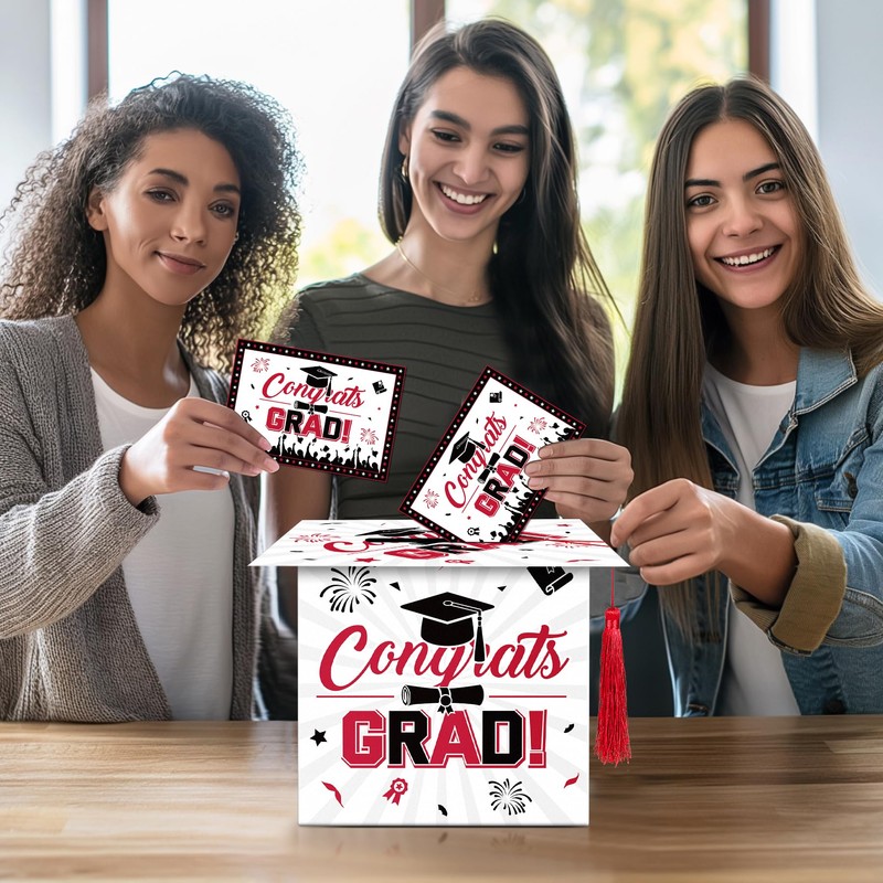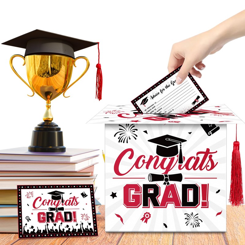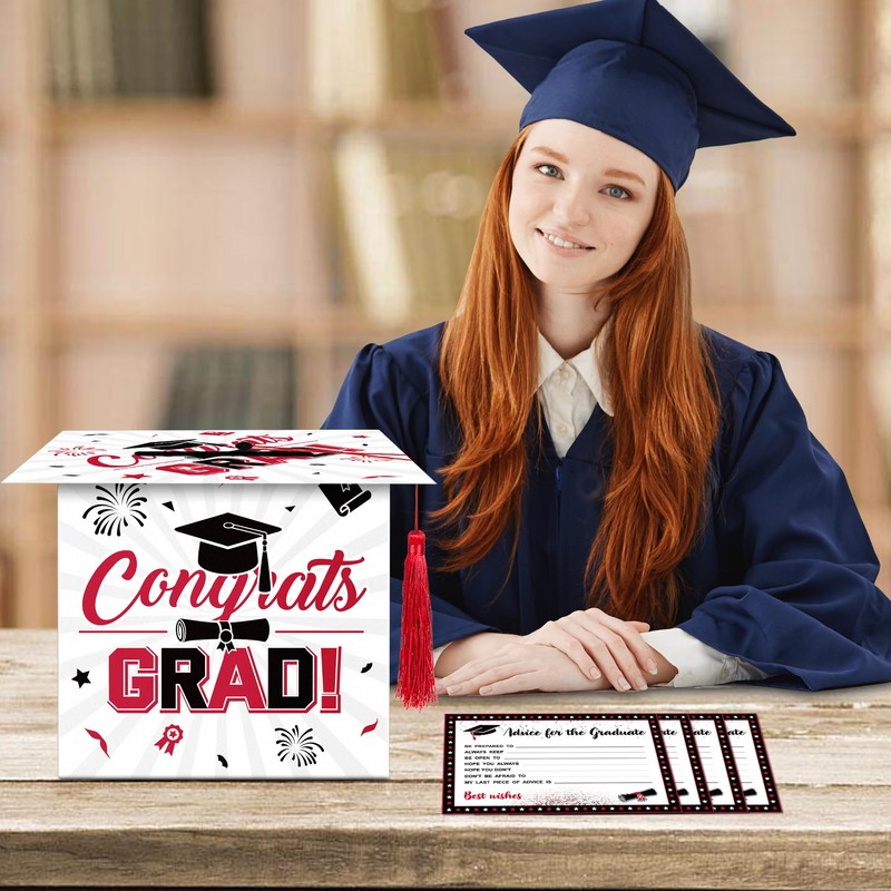 - PACKAGE INCLUDE - Graduation Party Favors includes 1 White & Red & Black Graduation Cap Shaped Card Boxes, 1 Red Tassel and 48 PCS Advice Wishes Cards. Enough quantity to meet your graduation party needs! Ideal for 2025 graduation ceremony party!