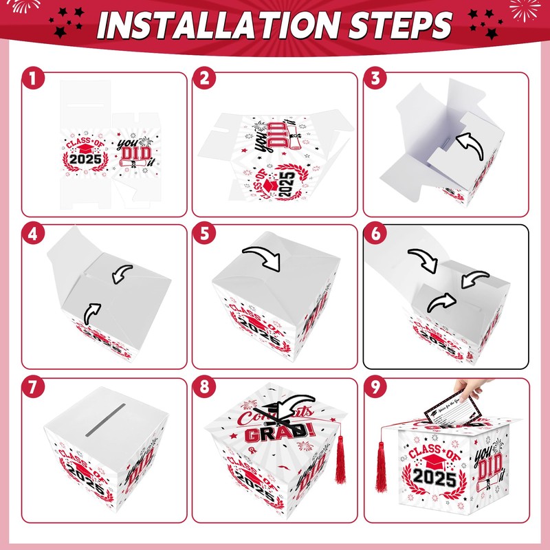 - EASY TO INSTALL - The graduation cap box is foldable design, folded for delivery to ensure that the box is well protected. You can follow the installation steps to assemble containers. The box is assembled in the shape of a graduation cap and is perfect for a graduation party!