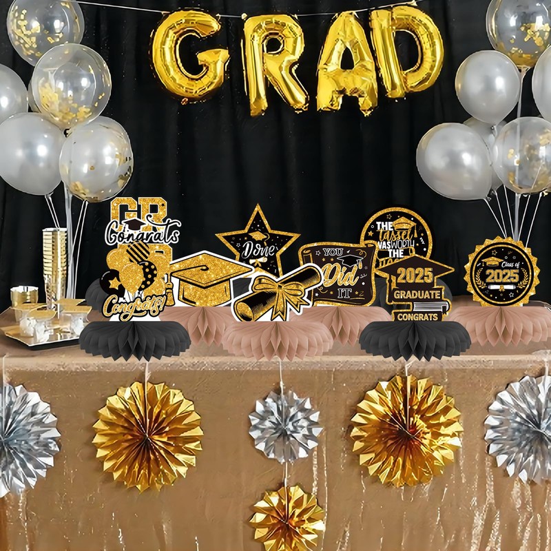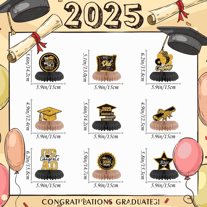 - COMPLETE SET: Includes 9 unique graduation-themed honeycomb centerpieces featuring Class of 2025 designs in elegant black and gold color scheme