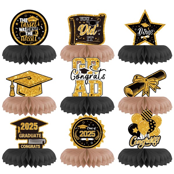 Class of 2025 Graduation Decorations Honeycomb Centerpiece, 9pcs Gold and Black Graduation Table Decorations, Congrats Grad Centerpieces for Tables