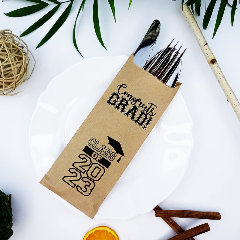 Make your graduation ceremony, grad party, or any occasion memorable with our Graduation Kraft Paper Silverware Bags, combining style, functionality, and eco-consciousness for a standout celebration.