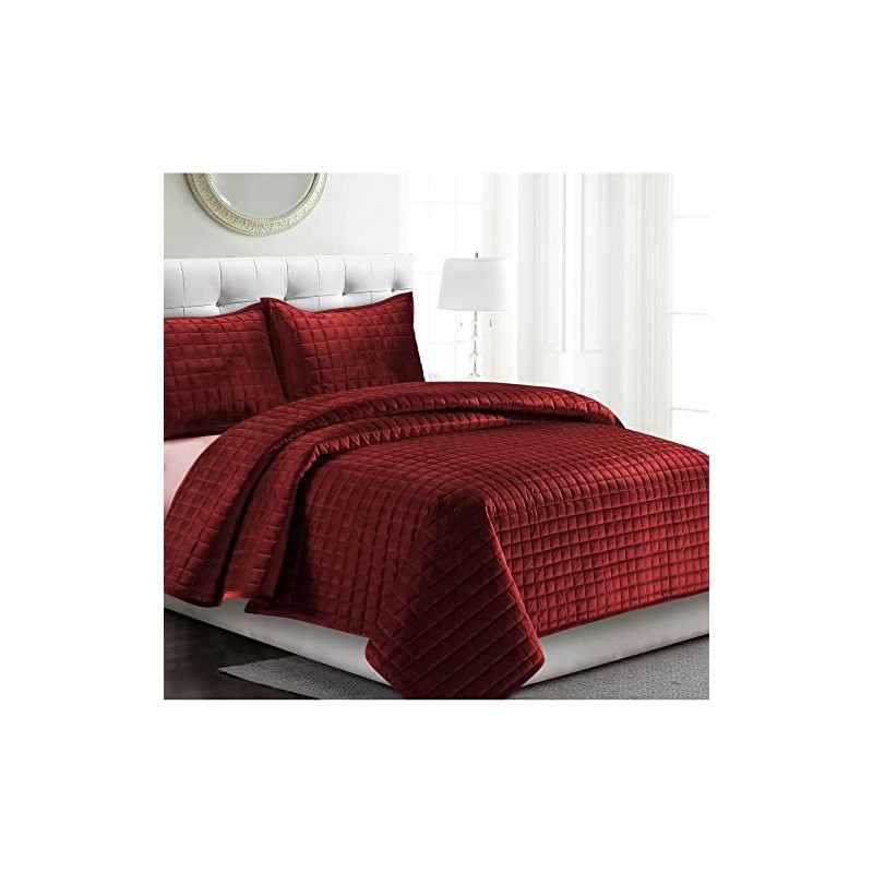 - Classic 3-Piece Oversized Velvet Quilt Set | Queen Size, Pretty Burgundy Color | Solid Pattern with Square-Box Stitching. | Durable Christmas & All Season Contemporary Aesthetic Bedding | Soft Feel