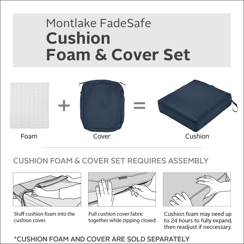 Offering elegant, understated style, our Montlake weather-resistant outdoor seat and back patio cushions features our durable Fade Safe Fabric System. Our patio cushions keep their look season after season while resisting stains and providing lasting comfort with your patio furniture. When you buy a Classic Accessories patio cushion you are not just getting a cushion; you're also purchasing lasting comfort and peace of mind. Not only with your patio cushions be protected from the elements, but you'll be protected with the easiest warranty in the industry. If your patio cushion fails within the warranty period, look for us online and take advantage of our Hassle-Free warranty program supported by our US-based customer service team. Montlake's fade resistant patio seat cushion material makes these lawn chair cushions both stylish and engineered to last longer. Weather resistant fabric resists stains and helps keep rain out and protects the patio furniture cushion foam. Adjustable belted hem with click-close straps provides a tight, customizable fit to keep outdoor patio cushions where you want them. Extra long straps tie around patio furniture to secure the outdoor chair cushions and keep them where you want them. Engineered seams and double topstitching at the most demanding joints provide strength and durability for your outdoor cushions. The zippers lock to keep a tight closure and are stored in protective garages when close to give your patio seat cushions a clean, protected look. One-year limited warranty.