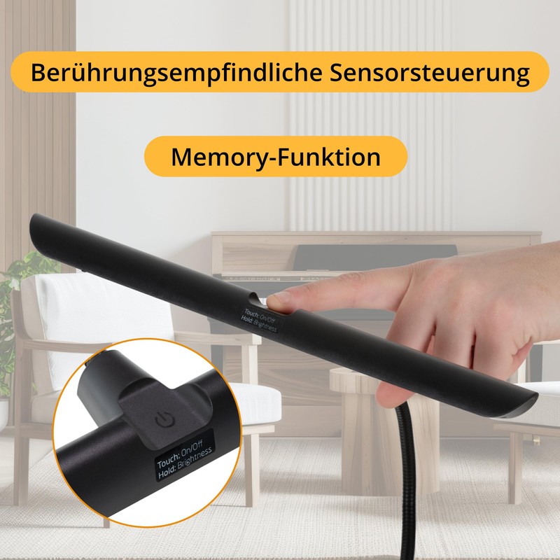 - Flexible positioning: the 26 cm gooseneck and the lamp head ensure that the light reaches exactly where you need it. The metal clamp holds on music stands, tables or music shelves up to a material thickness of 20 mm