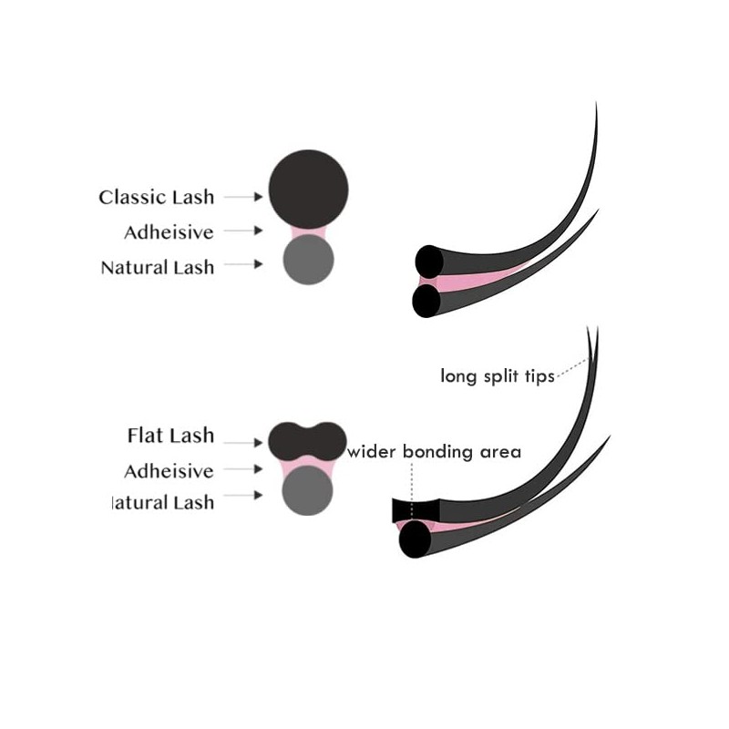 • Ellipse eyelash extensions are also called flat lashes, classic lashes, because their special shape forms a special function. The base is a grooved shape, which increases the bonding area.