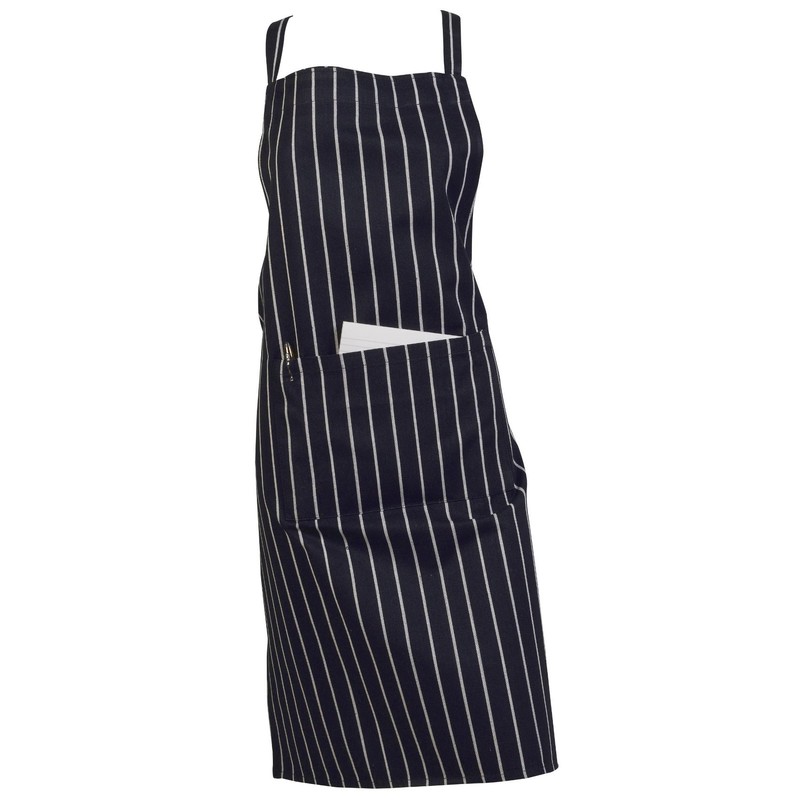 - Available in Black or Navy Blue with white stripes throughout, with the option to buy the aprons singularly or in a pack of 5 or 10. The aprons measure approximately 68cm (27.5") wide x 90cm (35.5") long.