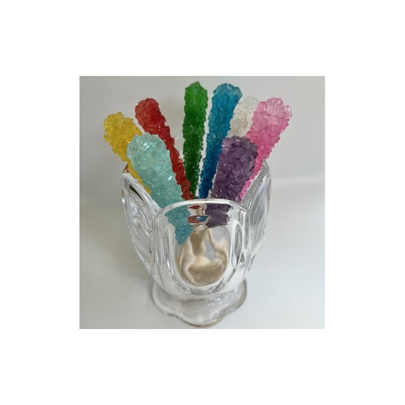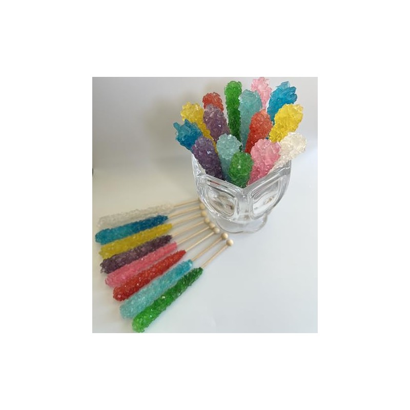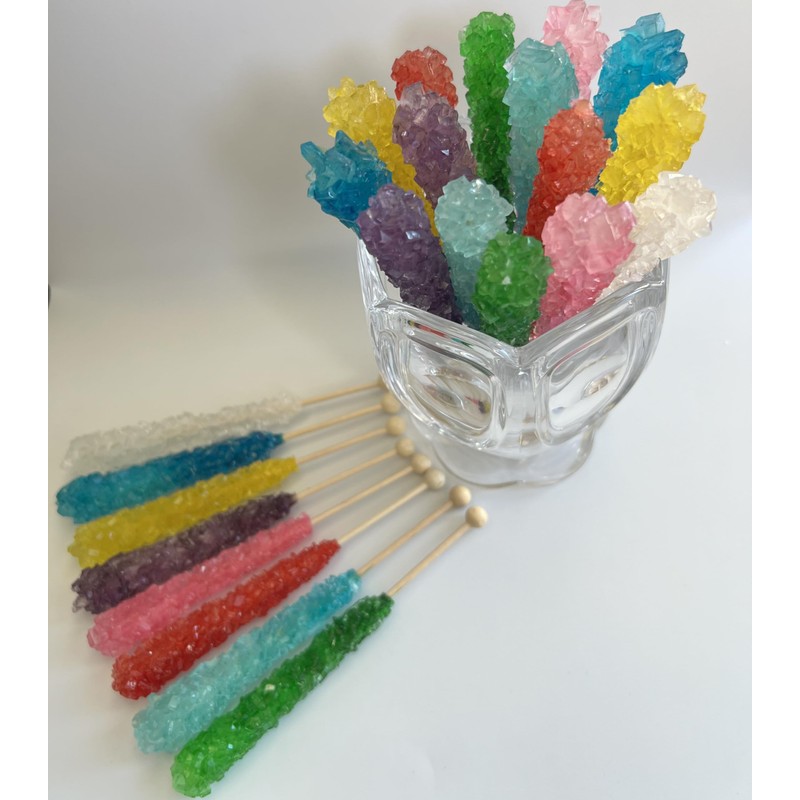 - Assorted Flavors and Colors including: Purple Grape, Pink Cherry, Light Blue Cotton Candy, Blue Raspberry, Red Strawberry, Green Apple, Yellow Mango, and Clear White Rock Candy Sticks.