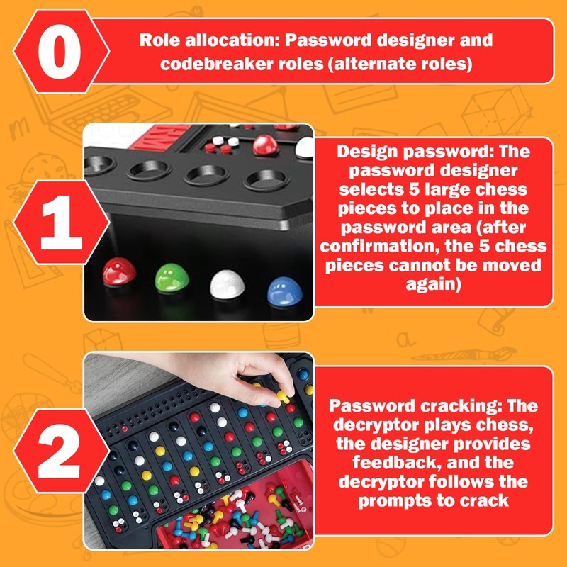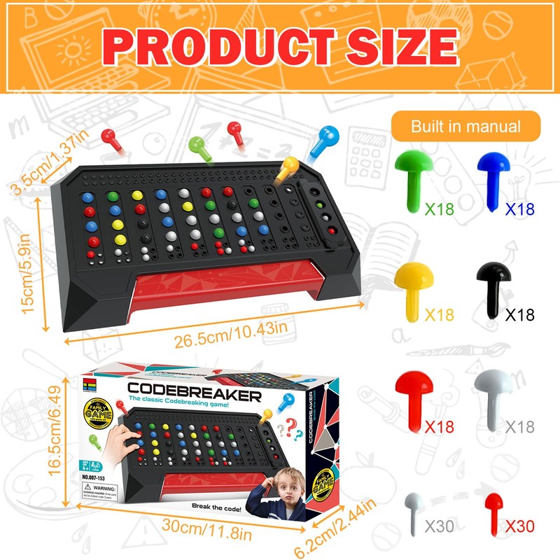 - Challenge your brain: Can you crack the code faster than your opponent in this decryption game? Guess the colour and position of your opponent's tokens as quickly as possible to win!