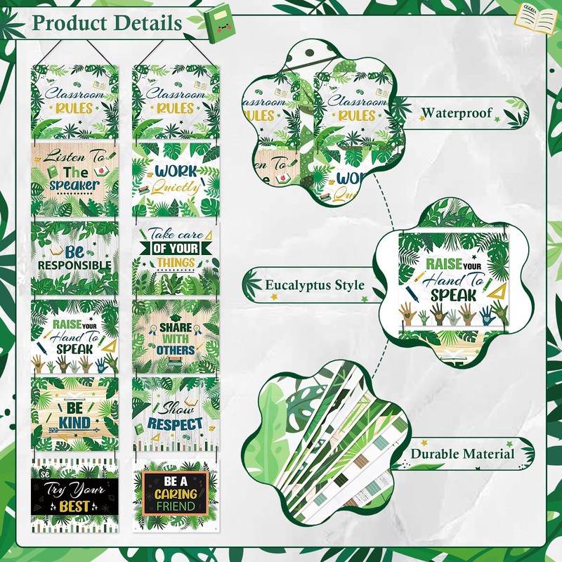 • ✨【Eucalyptus Design】This classroom rules banners use different motivational texts and eucalyptus patterns as the background, which can add youthful vitality to children in the learning process and stimulate thinking. They are used as classroom bulletin board decorations, class motivational backgrounds, and classroom door porch sign decorations. ideal choice