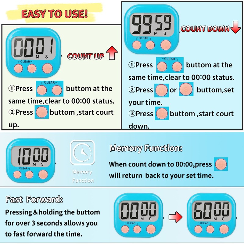- Memory Setting: You do not need to set the countdown time every time, it will remeber your last time and you only need to press "ST/SP" button.