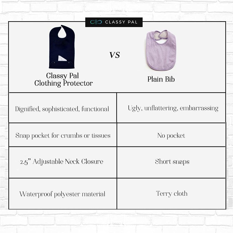 - Not Your Average Adult Bib - Classy Pal Clothing Protectors are much more than the typical adult bib on the market. The adult bibs for eating are composed of the finest soft navy blue terry cloth material with a waterproof inner lining to help under clothes stay clean when spills happen. For many adult senior citizens wearing a bib is demoralizing, but now your loved one can feel dignified, confident and beautiful.