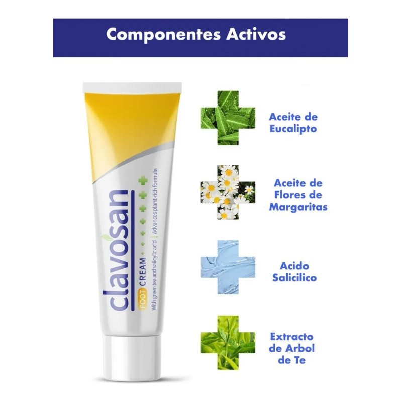 Clavosan es un tratamiento tópico intensivo diseñado para eliminar hongos en los pies y uñas, ayudando a restaurar el aspecto saludable de la piel y las uñas afectadas por micosis, mal olor o descamación. Se considera una alternativa mejorada frente a productos similares como Foot Trooper.