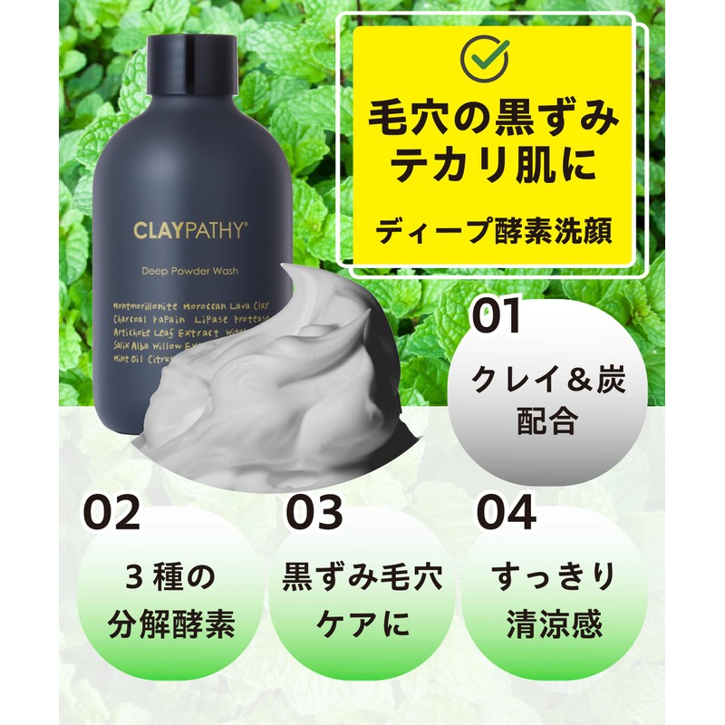 • Product Details: Claypathy Deep Powder Wash (Enzyme Facial Powder) / Contents: 2.8 oz (80 g) / Made in Japan / (No Ingredients) Mineral Oil, Silicone, Paraben, Synthetic Fragrance, Synthetic Coloring, Petroleum Surfactant, Ethanol, Talc (99% Natural)