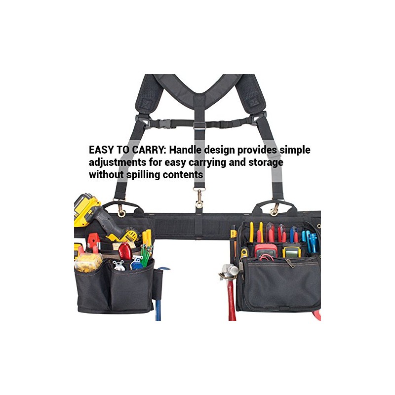 - EASY TO CARRY TOOL BELT: The handle design on this tool belt provides simple adjustments for easy carrying and storage without spilling contents.