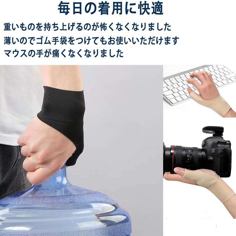 指や手首を固定し、手首への圧力を軽減することで、腱鞘炎や每日の捻挫などによる痛絮を徐々に和らげ、再負傷を防ぎます。
