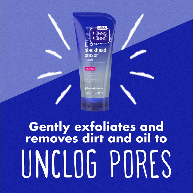 - 5-ounces of Clean & Clear Blackhead Eraser Facial Scrub with salicylic acid acne medication lifts away dirt, oil and impurities that can lead to pimples, blackheads and acne breakouts