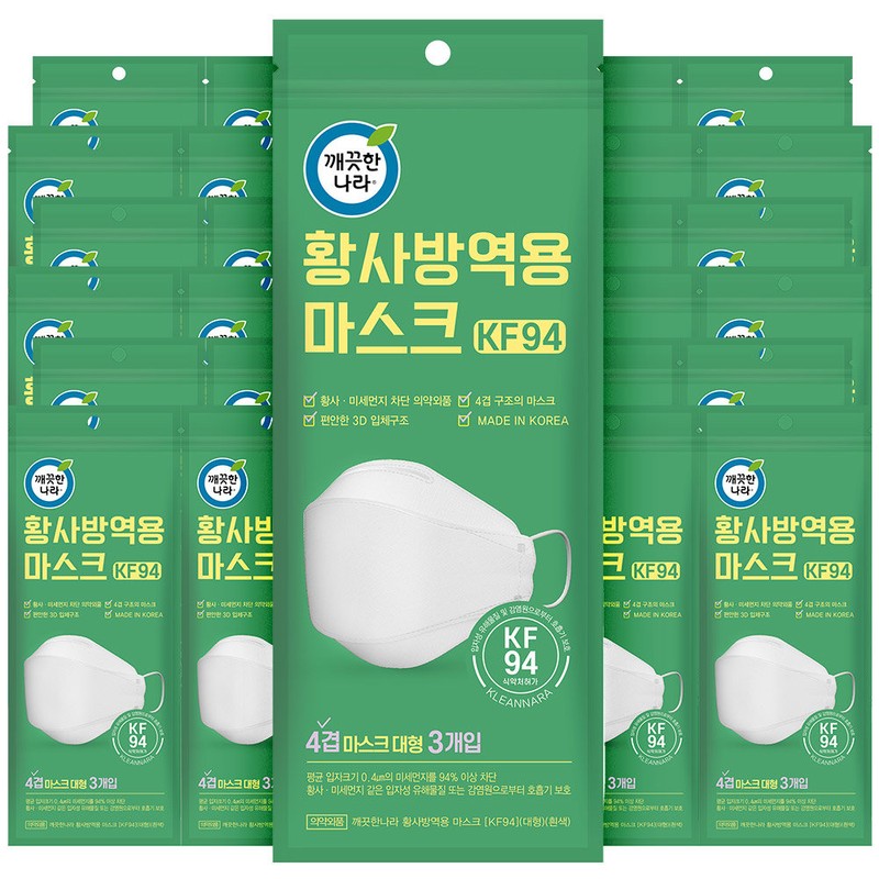 Clean Country Yellow Dust Quarantine Mask KF 94 White Large 3 Pieces 10 Packs (30 Sheets) / 깨끗한나라 황사 방역마스크 KF 94 화이트 대형 3입 10팩(30매)
