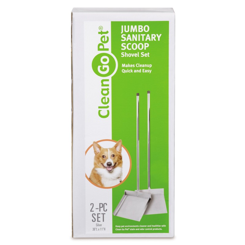 Clean Go Pet Jumbo Sanitary Scoop Sets feature spring-loaded locking pins that allow handles to be easily disassembled for storage Perfect for kennels and shelters, or in homes with larger breeds or multiple dogs Made of strong chrome-plated steel for unmatched durability Extra-large pan measures 11" x 9" Material: Chrome-plated steel Size: Each Jumbo Sanitary Scoop measures 11"L x 9"W x 36"H Care: Wipe clean with a damp cloth.