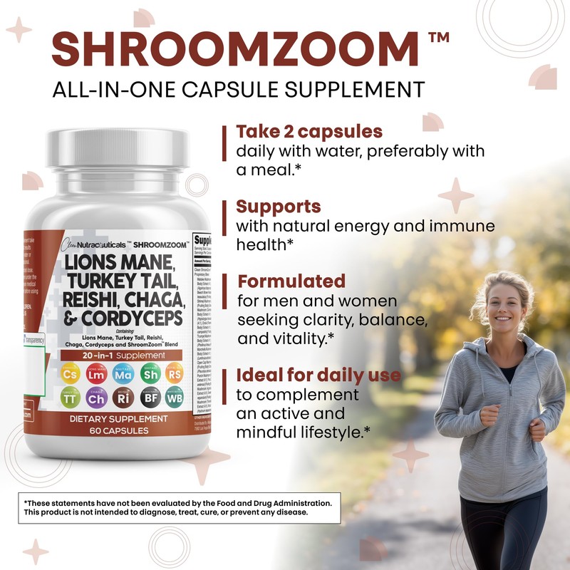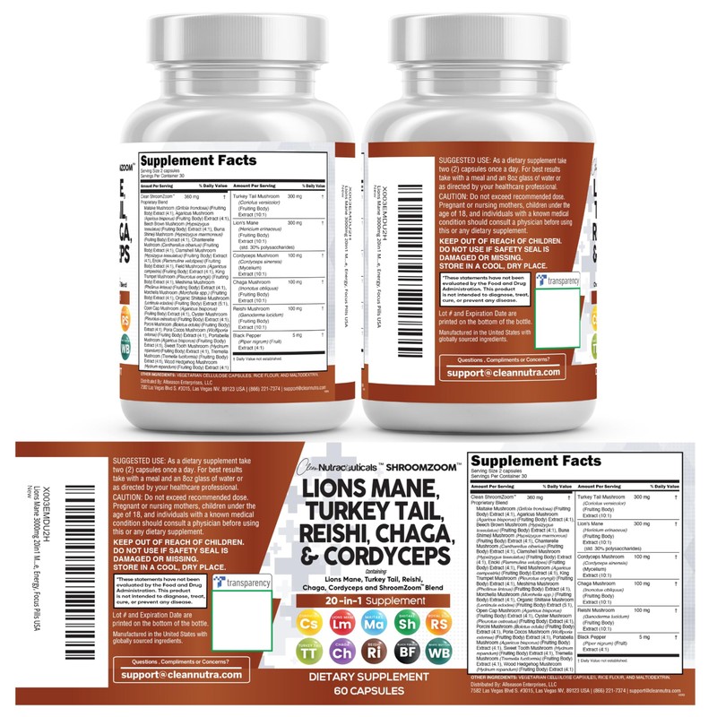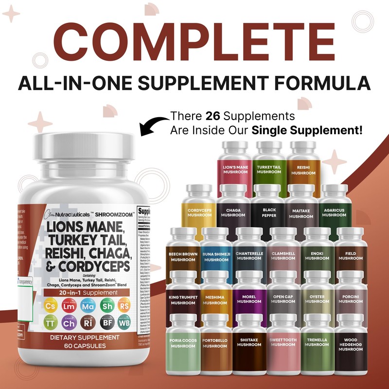 - A Powerful All In One Support Supplement - ShroomZoom is overflowing with potent lions maine, turkey tail capsules, reishi mushroom capsules, chaga extract, and cordyceps sinensis powder. Clear out those countless supplements in your supplement cabinet like reishi mushroom gummies and take just one lions main, turkey tail mushroom supplement, reishi extract, chaga pills and cordyceps supplement containing an overall 20-in-1 mushroom pills formula from Clean Nutraceuticals.