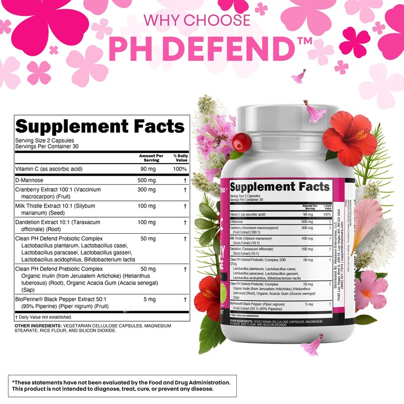 - Comprehensive Women's Health Formula: pH Defend is an all-in-one women's vaginal health formula. With a blend of Probiotics, Prebiotics, Cranberry Extract, and D-Mannose designed specifically for restoring balance in PH and your internal biome. Take 2 capsules of our vaginal health probiotics and experience relief within days.