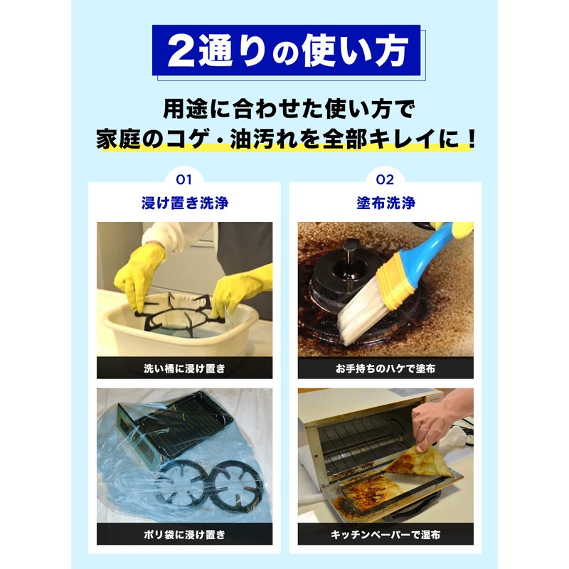 - (Applying Cleaning) Place liquid on brushes or kitchen paper on the stove, around the oven, and apply it to dirt for about 5 minutes, rinse it with water or brush to remove the cleaning agent. (Cleaning Instructions) Cookware, Trivets, Ventilation Fans, etc.; Place in a plastic bag or tub for about 15 minutes and rinse thoroughly. Please work in the sink