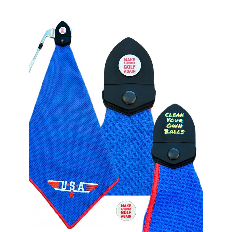 Fore! Keep your golf balls clean and ready for action with Clean Your Own Balls' magnetic golf towels featuring a Make America Golf Again ball marker. Convenient and Portable: Looking for a fun and functional way to clean your own balls on the golf course? Clean Your Own Balls has you covered. Easily snap to irons, wedges, or putter for on-the-go cleaning around the greens. Snap on the side of the golf cart for convenient cleaning after each shot. Lay your club grips on our towel to keep a firm grip on your game in rainy conditions. After your round, snap onto one of your long irons for safe storage. The magnetic golf towel goes where you go! Super Strong Magnet: Our towels are designed with an industrial strength magnet to easily attach to your golf clubs or golf carts. Take control of your game! High Quality Material: Our towels are made with an ultra-absorbent microfiber material which provide maximum water absorption and faster drying time after each round. You will have the cleanest balls on the course! Extended Lifespan: Our towels are machine washable, ensuring they stay looking great round after round. Give the gift of a clean game! Added Bonus: Our towels come equipped with a handy Make America Golf Again ball marker. Mark, clean, and place your ball so you give yourself the best chance to snake in putts! Optimize your ball flight and improve your putting while looking good, feeling good, and especially playing good. This towel pairs great with a USA golf bag, USA golf balls, USA golf tees or anything USA. Hit a hole-in-one with Clean Your Own Balls USA Golf Towel. USA, USA, USA! Order yours today!