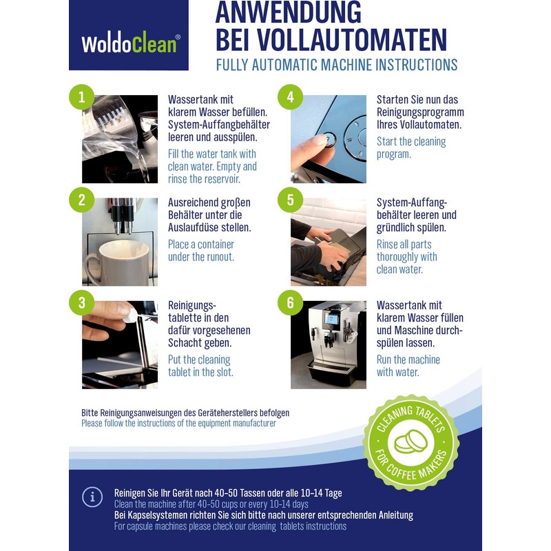 - Cleaning tablets for fully automatic coffee machines and coffee machines with automatic cleaning program for cleaning as an alternative to original tablets.
