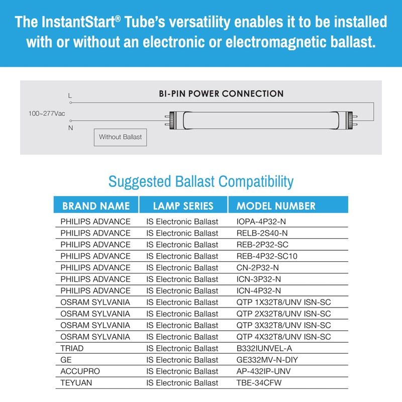 - ULTRA VERSATILE: The InstantStart Tube’s versatility enables it to be installed in T8 light fixtures with or without an electronic ballast/electromagnetic ballast. You can operate directly on approved existing electronic or electromagnetic ballasts for retrofits in the field, or bypass the ballast altogether and wire directly to AC line voltage (approved ballasts only)