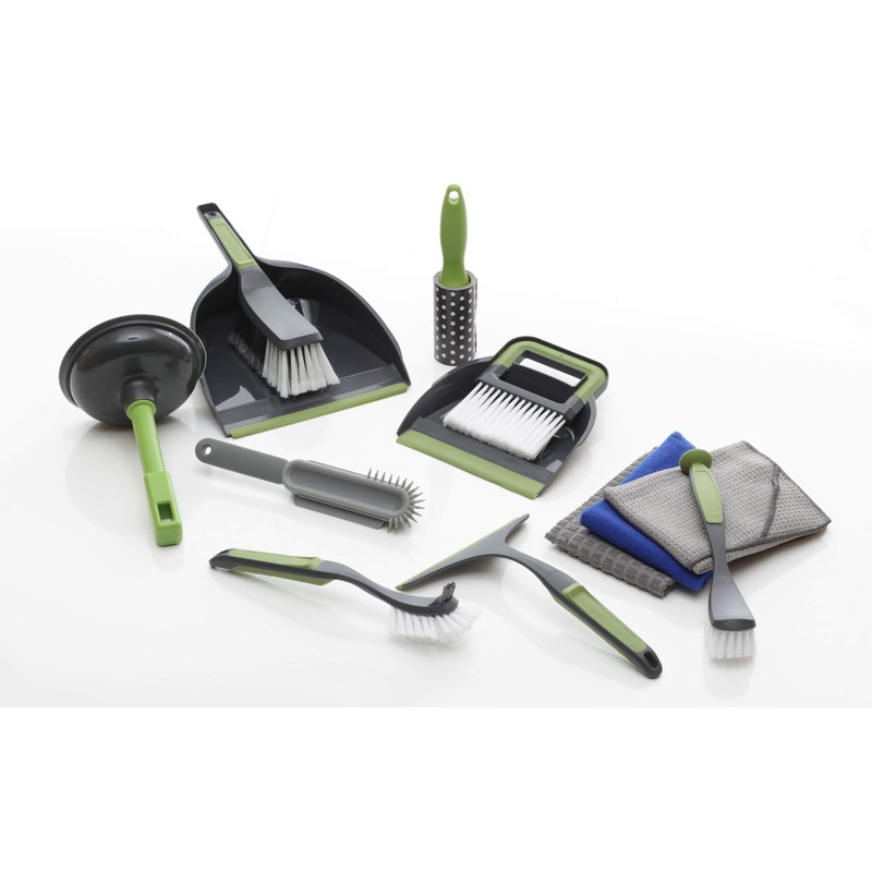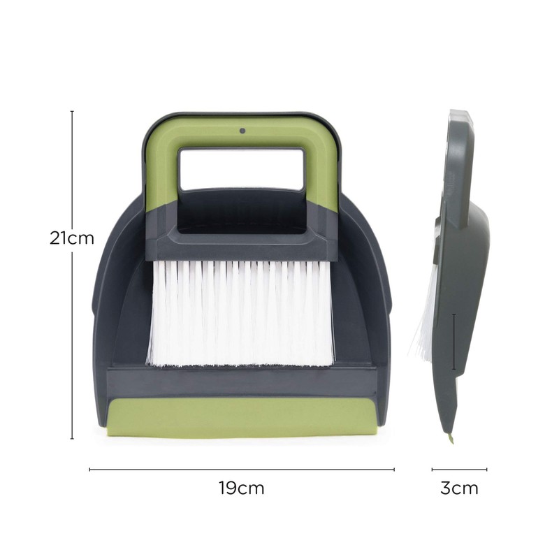 CleanPEAK Mini Portable Dustpan and Brush Set with Soft Grip Handle - 21cm x 19cm x 3cm – Grey / Green