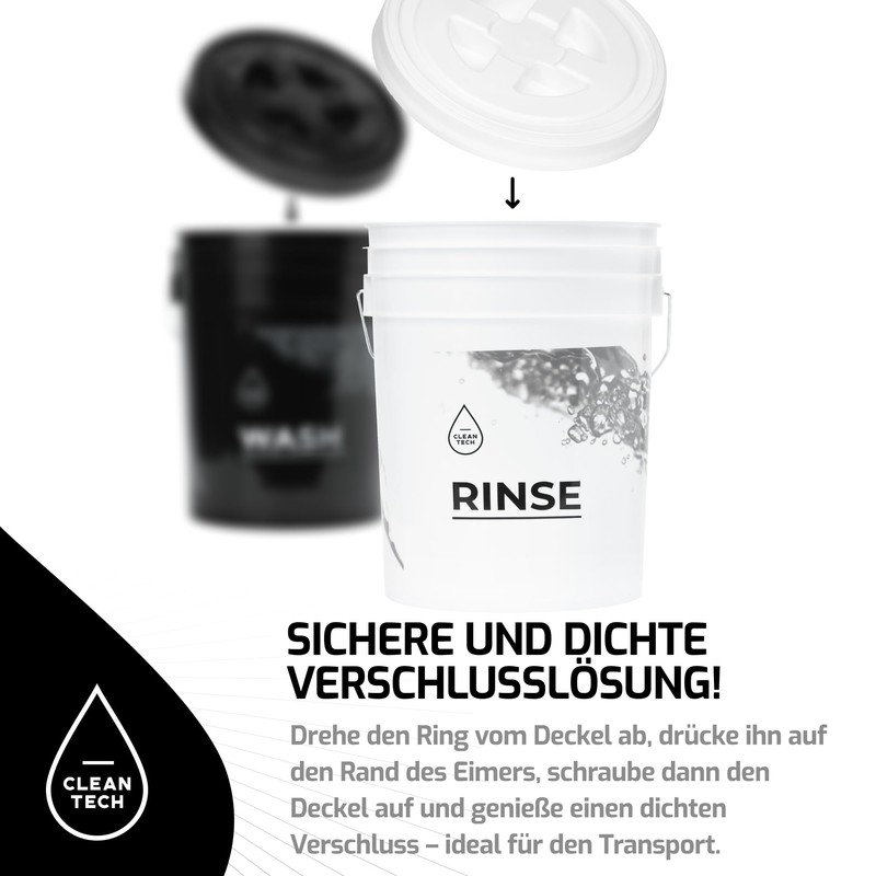 - Easy to transport – the CLEANTECH CO bucket lid for our 20 L washing buckets guarantees leak-proof and airtight sealing. Thanks to the special seal, the contents are always protected, so you can transport filled buckets with your favourite car shampoo and water, for example. This makes it an indispensable companion for detailing enthusiasts.