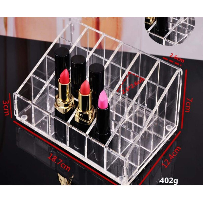 - It has many spaces for lipsticks and other cosmetics, such as moisturisers and nail polishes. The stepped layout allows you to easily see all of your products at a glance, so you can quickly find and compare the colours you want. It’s perfect for displaying your cosmetics on your dressing table or in your bathroom.