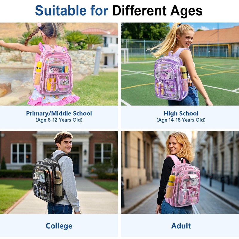 - 【Quick Security Check】: The transparent backpack approved by stadium, along with cute accessories and a small cloth purse, can protect your personal belongings from being seen and keep you happy all day long. It features visibility allow you to pass through security checkpoints quickly and efficiently. Suitable for multi-occasions such as school, work, stadium, travel, concerts, airports, sporting events, outdoor events, hiking, camping, beaches.
