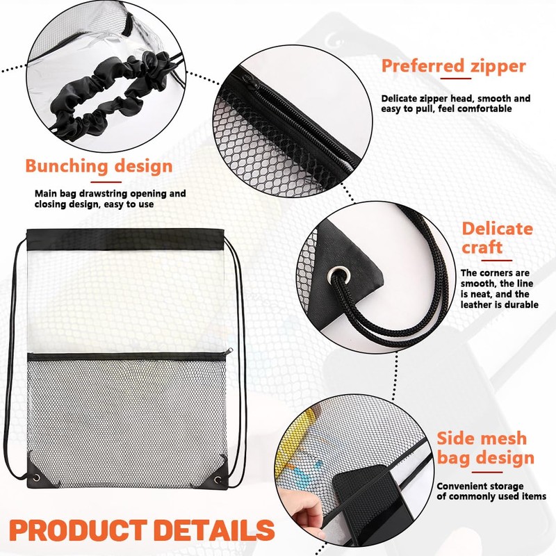 - Large capacity: you will receive a clear drawstring gym bag. The size of the drawstring bag is 13.39 x 17.72 inches/34 x 45 cm, and it also has a small mesh bag with zip on the outside. Large capacity can accommodate various items, the size is perfect for all your needs.