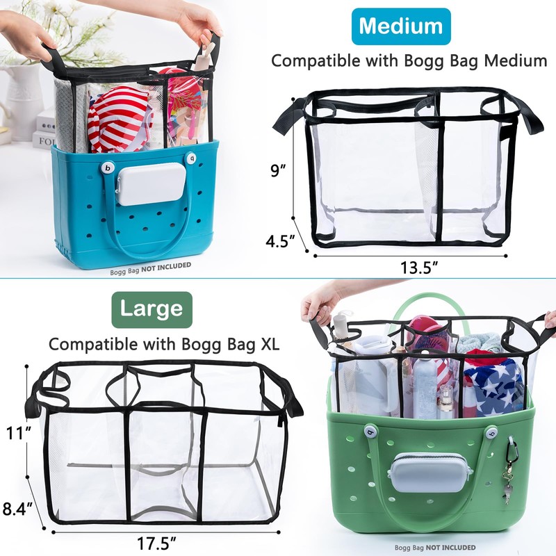 - CLEAR BEACH BAG ORGANIZER - The clear organizer insert is made of sturdy and lightweight explicit material; it can stand independently. The bag divider has multiple pockets: the large size has nine dividers, and the medium size has six dividers. The two side handles of the bag make it easy to obliterate the insert from the Bogg bag.