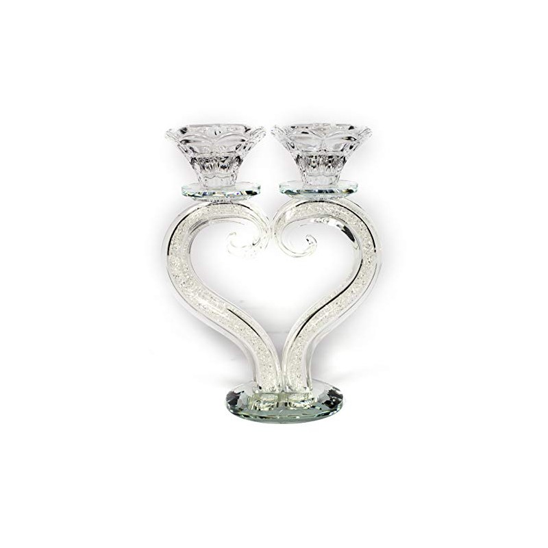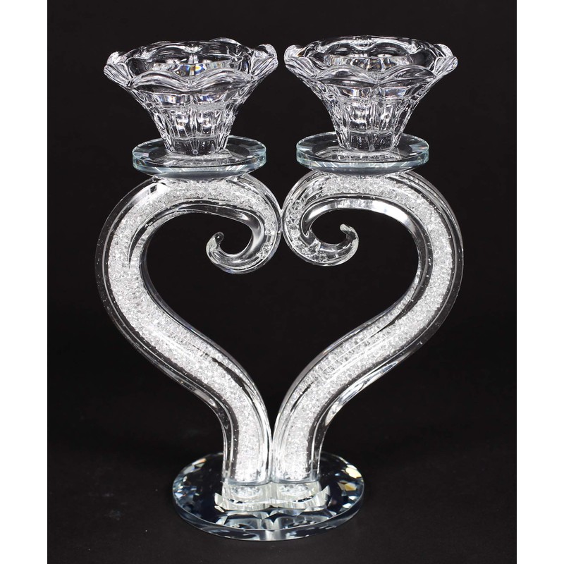 Clear Crystal Heart Shaped Candle Holder Two Taper Candles Shiny Beads in Ste...