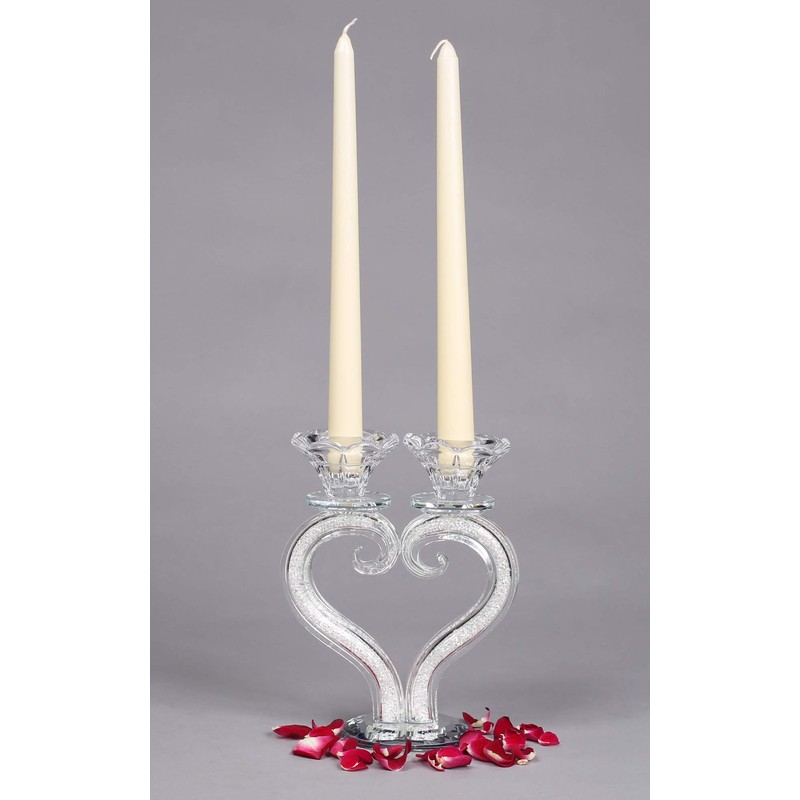 This heart shaped candle holder has a unique style. The stem is filled with shimmering white beads. There are two cups for taper candles. Perfect for wedding table decoration, reception, party or home decor. Candles not included